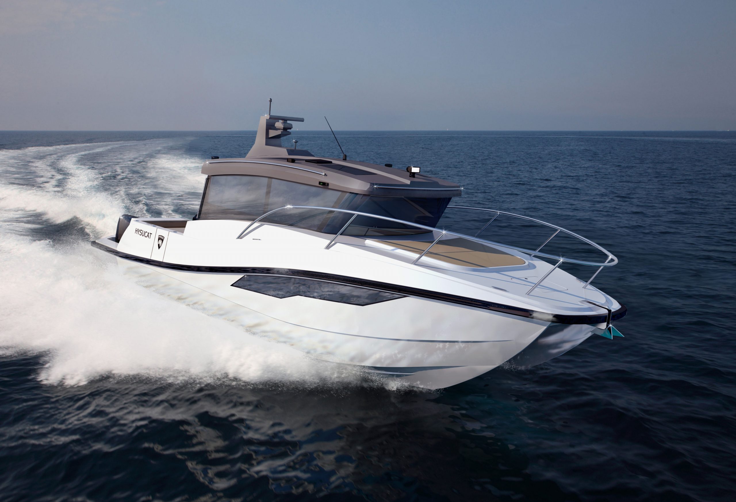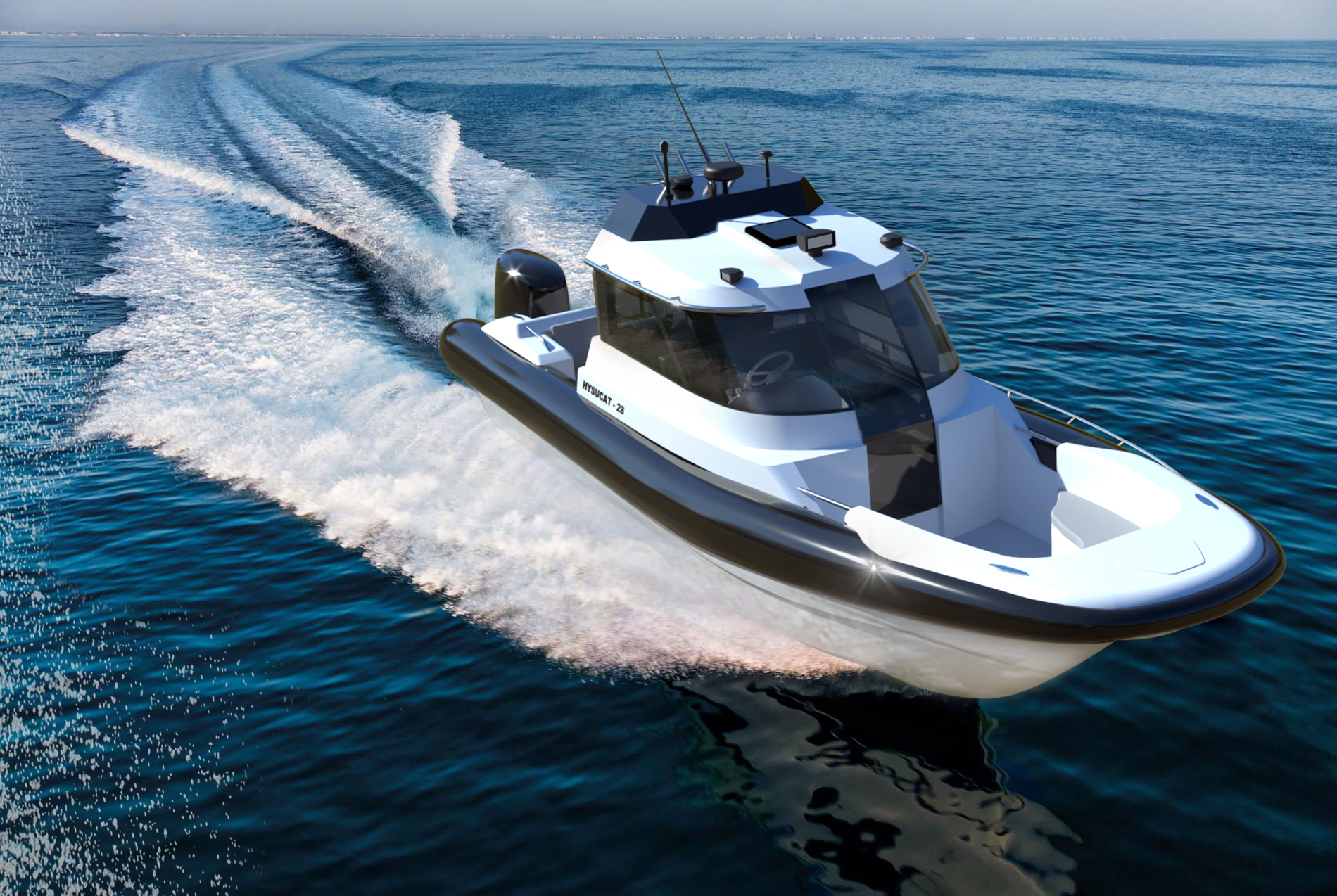Hysucat, an acronym for Hydrofoil Supported Catamaran, is the combination of a distinctively designed hull and foil incorporating hydrofoil science and technology. The Hysucat design used in center console, fast RHIBs (rigid inflatable boats) and water transport boats offers the best features of a monohull and a catamaran combined.